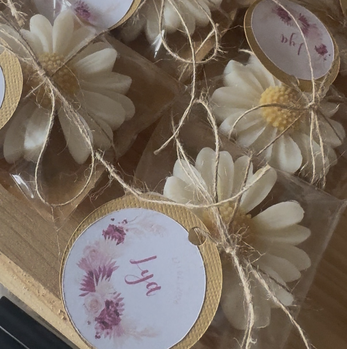 Craquez pour notre fondant parfumé en forme de marguerite, une création délicate et élégante, parfaite pour sublimer vos événements : baptême, mariage, anniversaire, communion, baby shower et bien plus encore. À la fois raffiné et original, ce petit cadeau personnalisé séduira vos invités par son esthétique soignée et son parfum envoûtant.