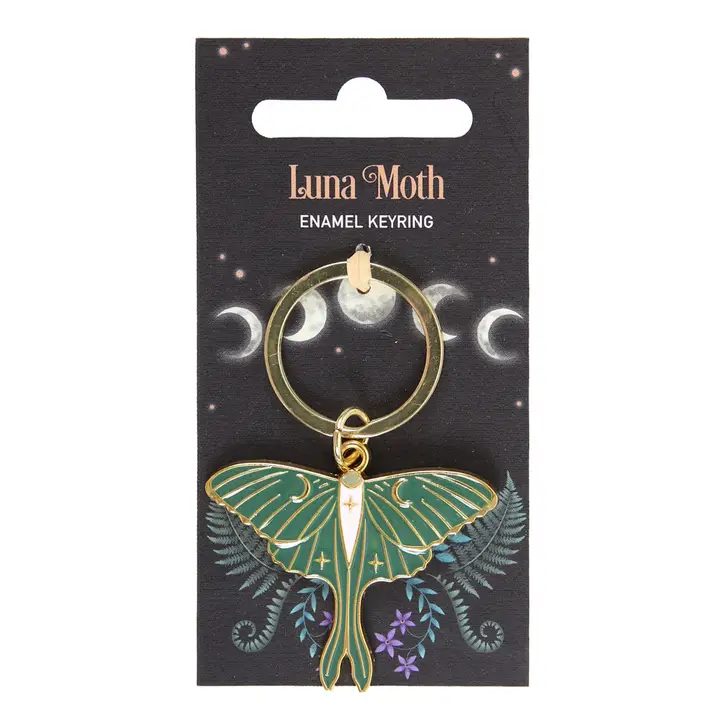 Ce porte-clés éthéré est orné d’une breloque en forme de papillon lunaire émaillée dorée sur une carte cadeau assortie.